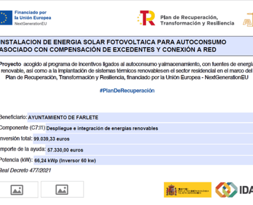 Ayuntamiento Farlete2025-02-24 10:51:372025-10-10 13:12:28Subvención proyecto acogido al programa de incentivos ligados al autoconsumo y almacenamiento, con fuentes de energía renovables: Instalación energía solar fotovoltaica en Farlete